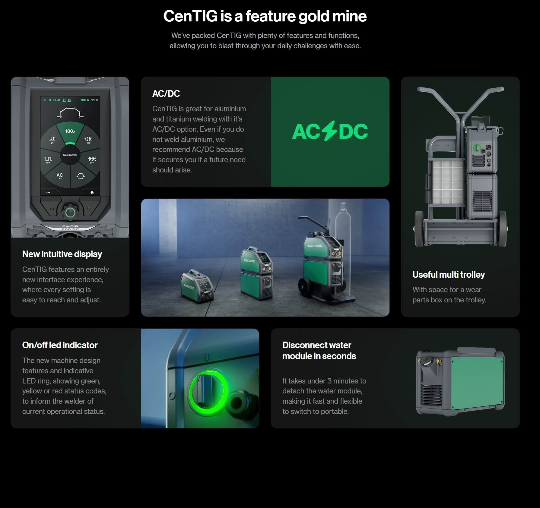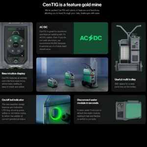 H CenTIG είναι η ιδανική επιλογή για συγκόλληση αλουμινίου και τιτανίου, προσφέροντας τη δυνατότητα επιλογής AC/DC για μεγαλύτερη ευελιξία και απόδοση. Ακόμα κι αν δεν προγραμματίζετε άμεσα να συγκολλήσετε αλουμίνιο, η τεχνολογία AC/DC αποτελεί μια έξυπνη επένδυση, διασφαλίζοντάς σας για μελλοντικές ανάγκες και εξασφαλίζοντας υψηλή ποιότητα συγκόλλησης σε διάφορα υλικά.