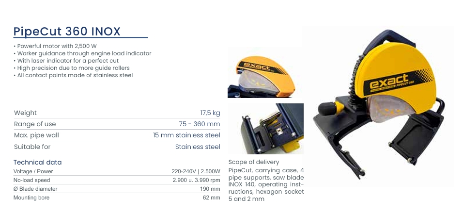Το Exact Inox 360 είναι η κορυφαία λύση για ακριβή και ασφαλή κοπή ανοξείδωτων σωλήνων, συνδυάζοντας καινοτομία, φορητότητα και αξιοπιστία.