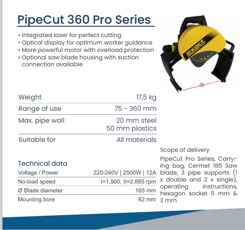 Το νέο ακριβές πριόνι σωλήνων “Pro Series 360” διαθέτει προηγμένα χαρακτηριστικά για κορυφαία απόδοση. Είναι εξοπλισμένο με ενσωματωμένο λέιζερ για ακριβή ευθυγράμμιση της λεπίδας, ισχυρότερο κινητήρα και προστασία υπερφόρτωσης, εξασφαλίζοντας μέγιστη απόδοση και ασφάλεια. Επιπλέον, ο οπτικός δείκτης ιδανικής ταχύτητας κοπής συμβάλλει στη μεγαλύτερη διάρκεια ζωής τόσο του κινητήρα όσο και της λεπίδας.