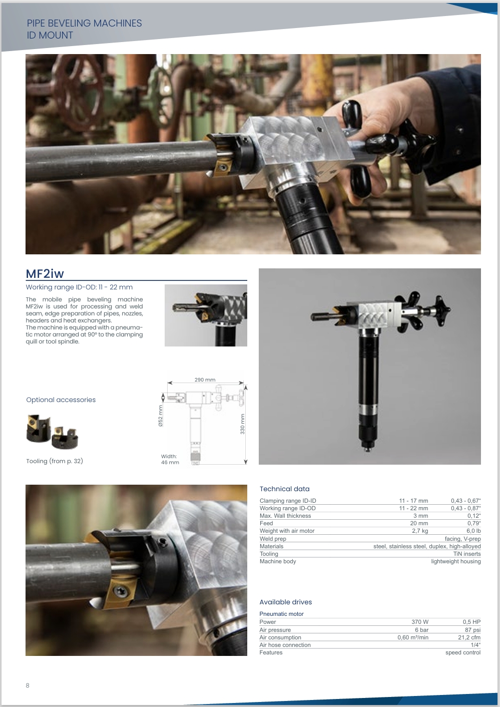 Η κινητή μηχανή λοξοτομής σωλήνων MF2iw είναι η ιδανική λύση για την επεξεργασία και συγκόλληση ραφών, την προετοιμασία άκρων σωλήνων, ακροφυσίων, κεφαλίδων και εναλλακτών θερμότητας. Σχεδιασμένη για επαγγελματική χρήση, αυτή η μηχανή συνδυάζει ισχύ και ευκολία στη χρήση.