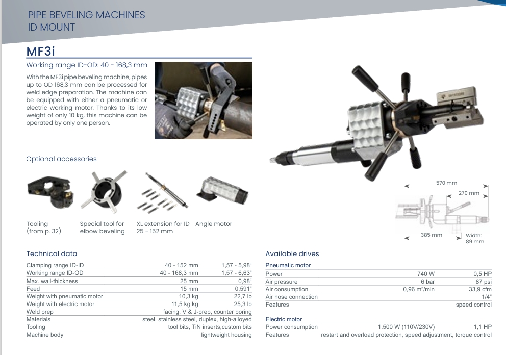 Η MF3i είναι μία εξαιρετικά ευέλικτη και ελαφριά μηχανή λοξοτομής σωλήνων, ιδανική για την προετοιμασία άκρων συγκόλλησης σε σωλήνες με διάμετρο από 40 έως 168,3 mm. Με την ευκολία που προσφέρει το χαμηλό βάρος της, μόλις 10 kg, η MF3i μπορεί να χειριστείται εύκολα από ένα μόνο άτομο, προσφέροντας αποτελεσματικότητα και ευκολία χρήσης σε απαιτητικές εργασίες.