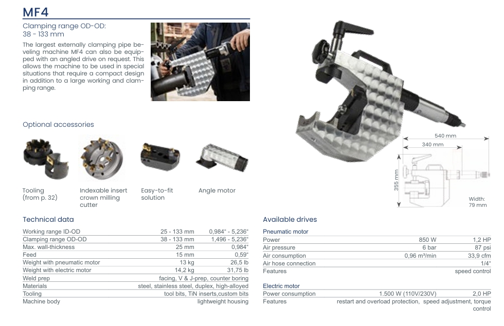 Η MF4 είναι μια εξαιρετικά αποδοτική μηχανή λοξότομησης σωλήνων, ιδανική για προετοιμασία άκρων και λοξότμηση σωλήνων με ακρίβεια. Ο εργονομικός σχεδιασμός και η χρήση ειδικών εργαλείων κοπής εξασφαλίζουν παραγωγικότητα και ευκολία στη χρήση, ενώ ο χαμηλός θόρυβος και η απουσία σπινθήρων την καθιστούν ασφαλή και πρακτική για επαγγελματικές εφαρμογές.